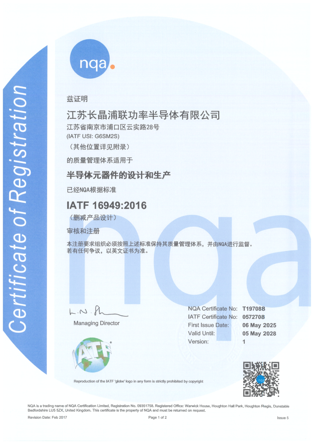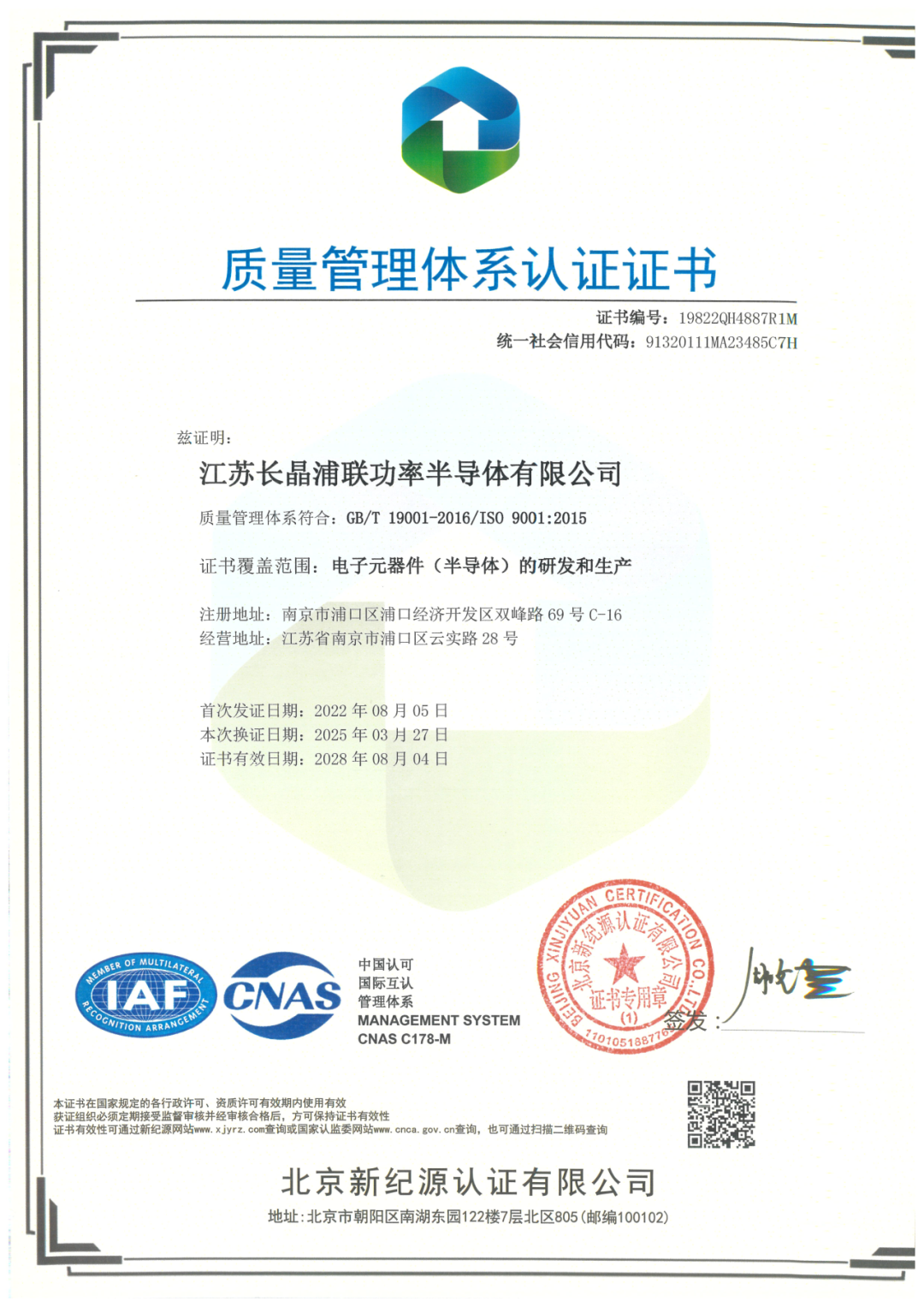 以标准立信,以体系赋能。作为长晶科技布局功率半导体封测的重要一环,江苏长晶浦联功率半导体有限公司自成立以来,始终秉持“全员参与、追求卓越、信守承诺、客户满意”的质量方针,持续构建科学、规范、高效的现代化管理体系。如今,长晶浦联已成功建立覆盖质量、环境、职业健康安全、汽车质量管理及有害物质管控等关键领域的权威管理体系,并不断拓展在静电防护、碳足迹等前沿方向的认证布局,全面支撑半导体高端制造的自主可控和可持续发展。